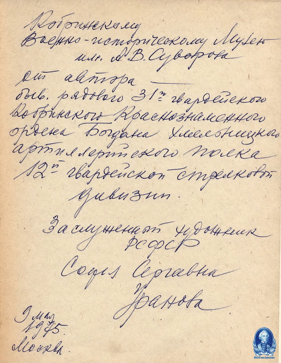 Фронтовой дневник художницыФронтовой дневник художницы Кобринский военно-исторический музей имени А.В. Суворова продолжает проект «80 лет музею, или Парад раритетов». Раз в месяц из фондов извлекается предмет, который посетители никогда раньше не видели. Майский раритет - это книга воспоминаний Софии Урановой «Четыре года в шинели. Фронтовой дневник художницы 1942–1945», которая представляет собой уникальное сочетание литературных записей и графических зарисовок. Накануне 9 мая, в преддверии великого праздника, этот экспонат был представлен публике. Дата выбрана не случайно: именно 9 мая автор подписала книгу в дар музею. В этот же день родилась сама Софья Сергеевна Уранова - писательница, художница, фронтовик. А накануне праздника, 8 мая 1995 года, в Кобрине открылась экспозиция, посвящённая истории города, в создании которой ключевую роль сыграли ветераны 12-й гвардейской стрелковой дивизии. Дневник передал музею участник освобождения Кобрина, ветеран той самой 12-й дивизии - Владимир Прокофьевич Бородин. Он прошёл путь от заместителя от разведчика до политрука до разведчика, освобождал Кобринщину, но еще один подвиг ему довелось совершить после войны. Став заместителем председателя Совета ветеранов дивизии, Бородин добился финансирования на строительство второго здания музея имени Суворова в Кобрине. Благодаря настойчивости совета ветеранов в конце 1980-х годов удалось доказать необходимость отдельной экспозиции об истории города - пять её залов посвящены событиям Великой Отечественной войны. Владимир Прокофьевич передал в фонды десятки документов, фотографий и книг, среди которых - тот самый дневник. На титульном листе издания - дарственная надпись: «Кобринскому военно-историческому музею им. А.В. Суворова от автора - бывшего рядового 31-го гвардейского Кобринского Краснознамённого ордена Богдана Хмельницкого артиллерийского полка 12-й гвардейской стрелковой дивизии. Заслуженный художник РСФСР София Сергеевна Уранова. 9 мая 1975. Москва». ![]() Софья Сергеевна родилась 9 мая 1910 года. Она была ученицей известного живописца, академика М.В. Нестерова. Огромную поддержку ей оказал А.М. Горький: он купил её первую работу и помог совершить путешествие по Западной Европе для знакомства с шедеврами мирового искусства. С начала Великой Отечественной войны Уранова рвалась добровольцем на фронт, но только весной 1942-го при содействии оргкомитета Союза художников СССР она вступила в ряды Красной армии. В шинели рядового, с блокнотом и карандашом художница прошла с 12-й гвардейской дивизией путь от Калуги до Берлина. Под обстрелами, когда «карандаш выпадал из рук», она доставала тетрадку и записывала. Так родились эти дневниковые записи о войне - честные, страшные и светлые одновременно. «Я старалась рисовать каждый свободный час, - писала Уранова. - И только в те дни, когда опасности были так велики… силы не выдерживали. Тогда я записывала в тетрадку то, что невозможно было нарисовать!» Дневник был издан в 1967 году. Название для книги художница придумала сама - «Четыре года в шинели». После публикации она получила тысячи писем со всего Советского Союза от благодарных читателей, которые хорошо помнили описанные события. За воинскую доблесть Софья Сергеевна награждена орденом Красной Звезды, медалями «За освобождение Варшавы», «За взятие Берл